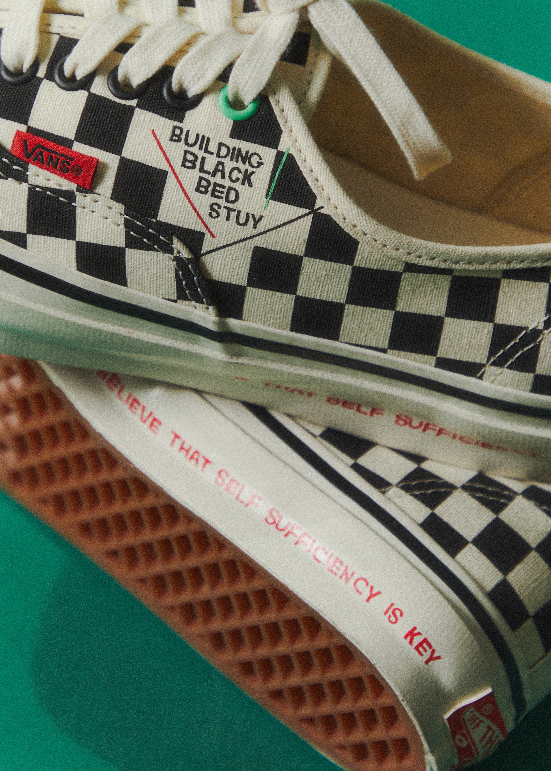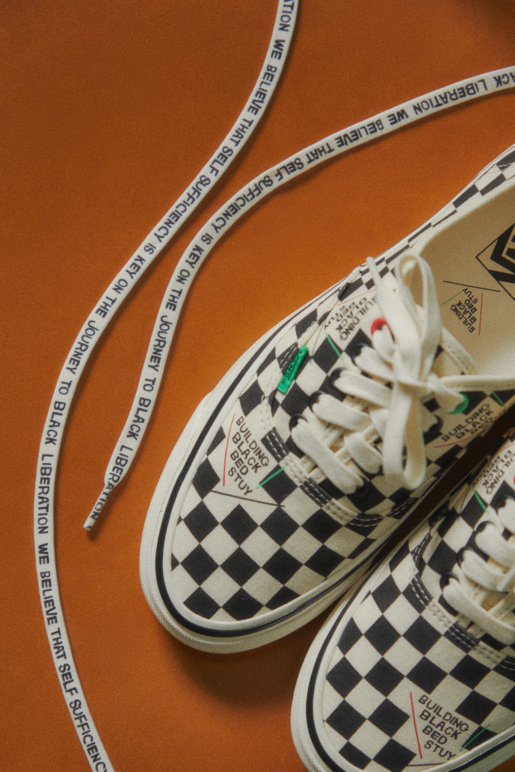 Rajni: We aimed to create something in line with our simple yet bold logo. The design aesthetic had to incorporate the colors of the Black Liberation Flag, which are also part of our BBB logo. The check print, unmistakably Vans, was a focal point that we wanted to emphasize and add texture to. The checkerboard print is a classic loved by people of all ages and backgrounds. However, the design element we knew we had to include was the BBB Statement, which we achieved by having it written out on the laces. This hidden gem is not so hidden and makes a bold statement about why Building Black Bed-Stuy is worth supporting.