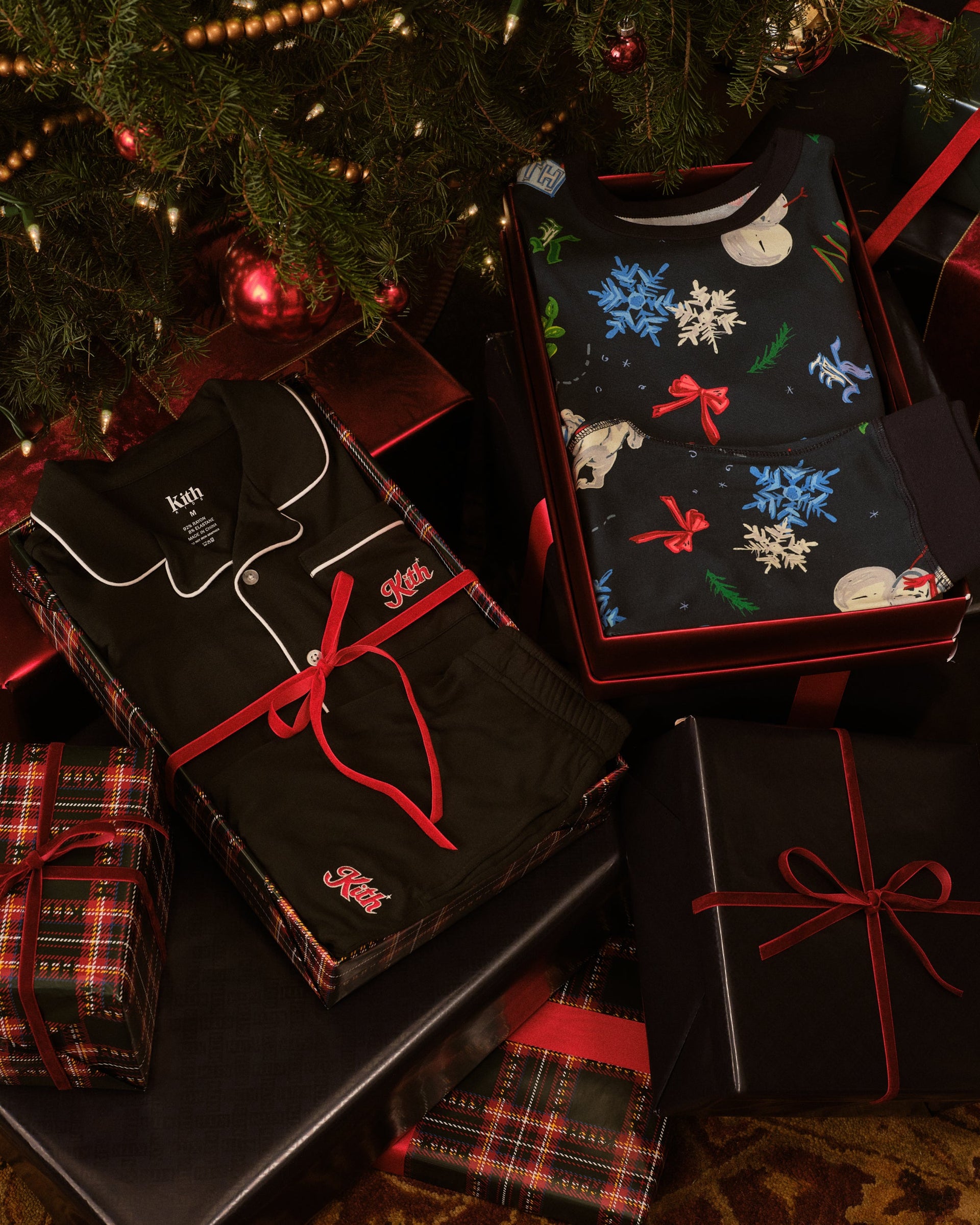 Discover a range of holiday-ready apparel highlighted by the Kith Monogrammed Shearling Coat, crafted from warm lamb shearling, and the Kithmas Duster Cardigan elevated with seasonal embroidery. Additional highlights include the Maverick Bow Hoodie with the matching Lorah Micro Bow Short featuring intricate faux-pearl detailing, the Tanner Sweater Hoodie with signature jacquard artwork, and the Hunter Fairisle Quarter-Zip rendered in chenille. Matching lounge sets wrapped in custom Kith gift boxes round out the apparel assortment. The collection continues into cold-weather accessories with jacquard leg warmers and Shearling Slippers adorned with all-over Kith Monogramming.