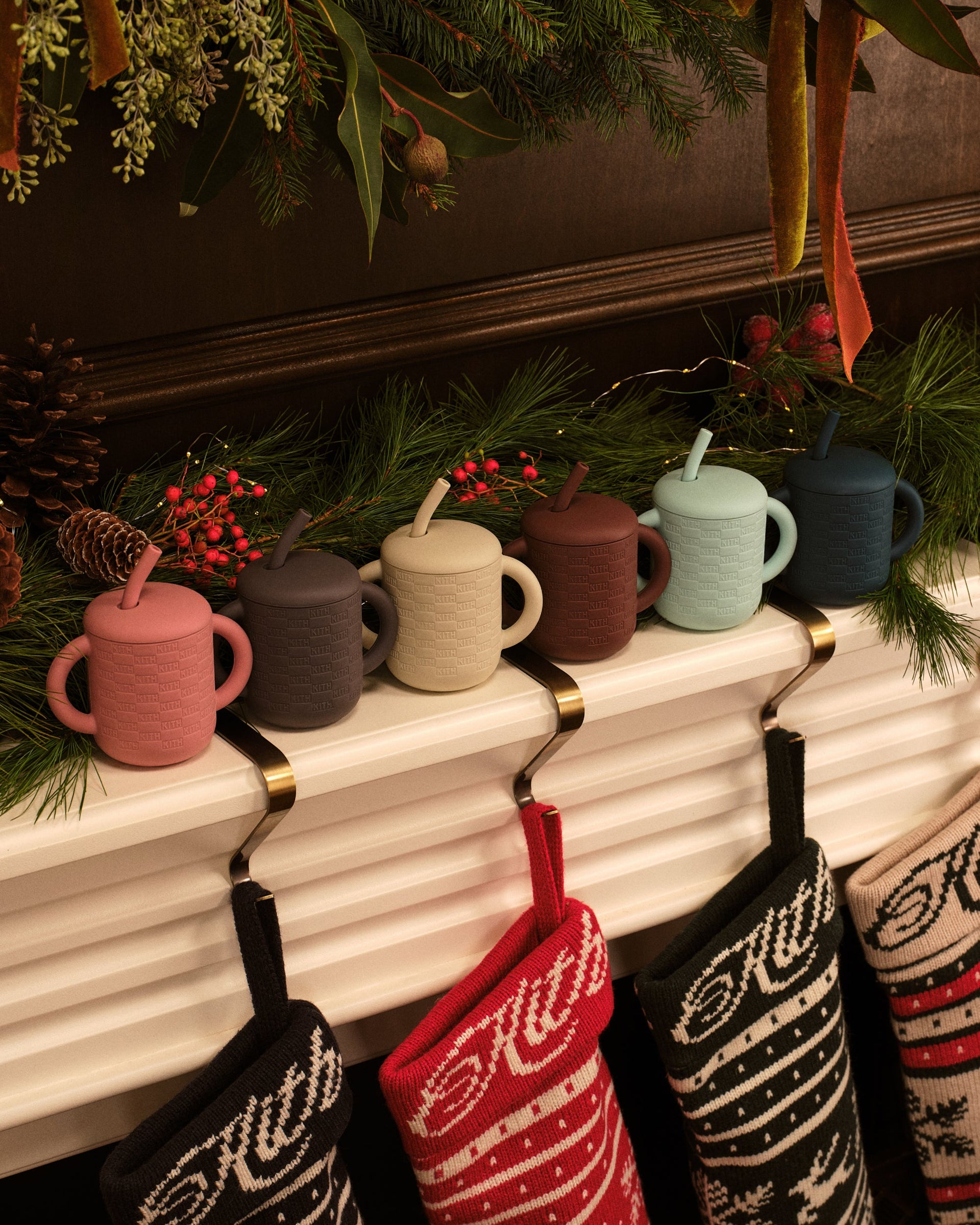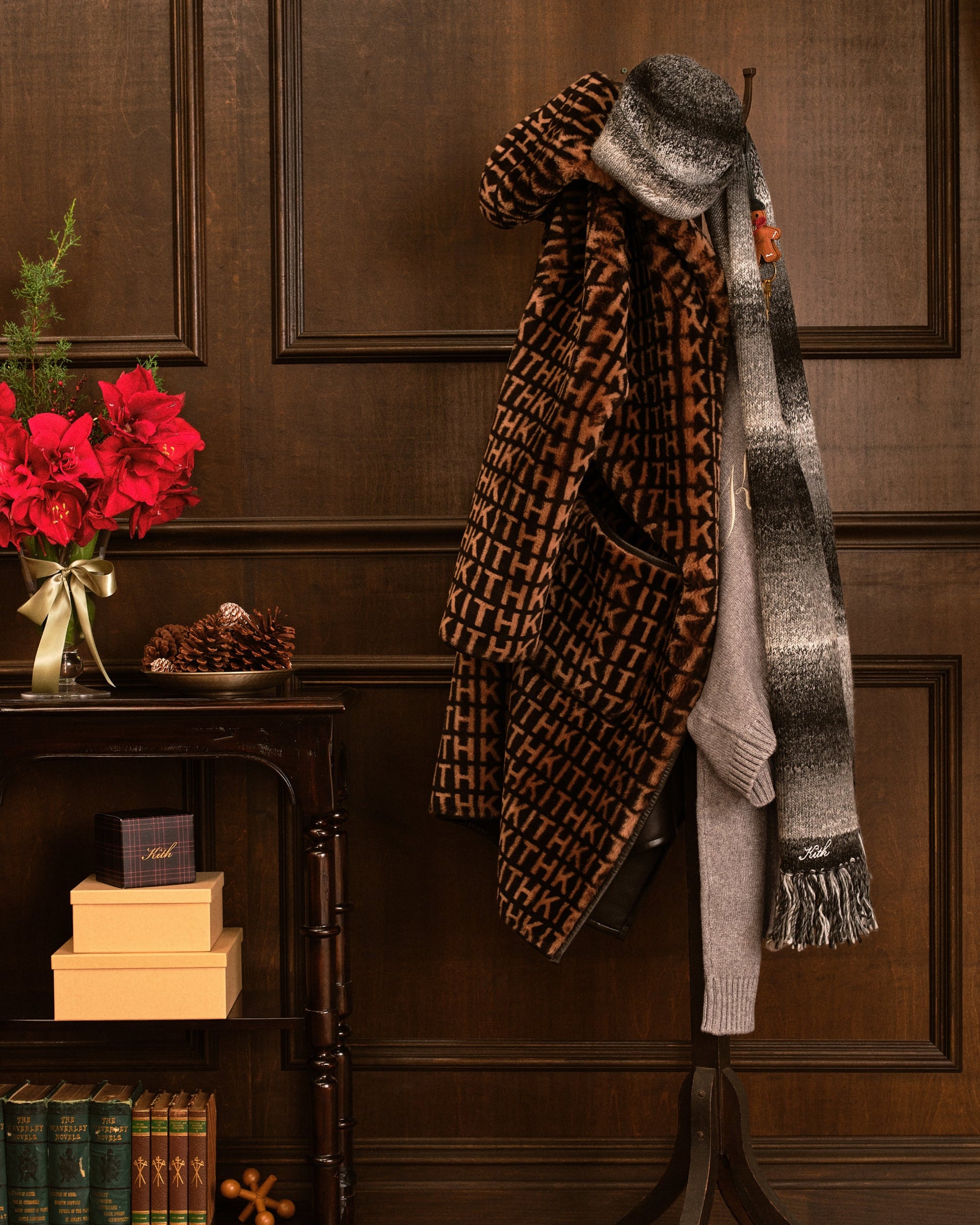 Headwear returns this season with ‘47, highlighted by the Captain RL silhouette, updated with satin-stitched embroidery for a refined finish. The collection expands with the Mia Beanie, offered in waffle chenille, Fairisle knit, and two-tone embroidered iterations featuring custom Kith artwork. Additional offerings feature knitted scarves in three seasonal colorways and ultra-soft shearling slippers, complete with Kith Monogramming and plush sheepskin lining, designed for the colder months.